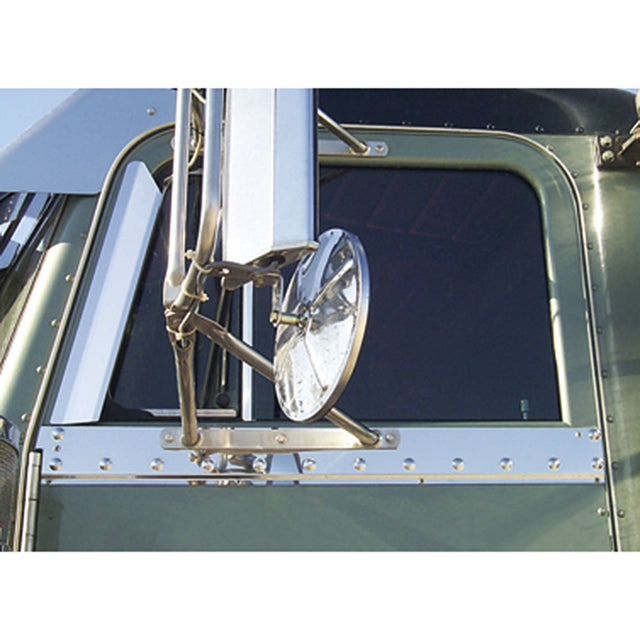 Peterbilt 379 - Carefully grind or drill rivets off. Use the provided hardware kit to install new part and reinstall the mirror bracket. The well nuts are put in the holes from the exterior of the truck. There is no need to remove the inside panel of the door, however, it is safer to remove the interior door panel and drill the rivets out from behind to minimize the chances of the door being damaged. This will require the window lift to b disconnected at the bottom in order to lower it down and out of the way, cutting the install time in half.