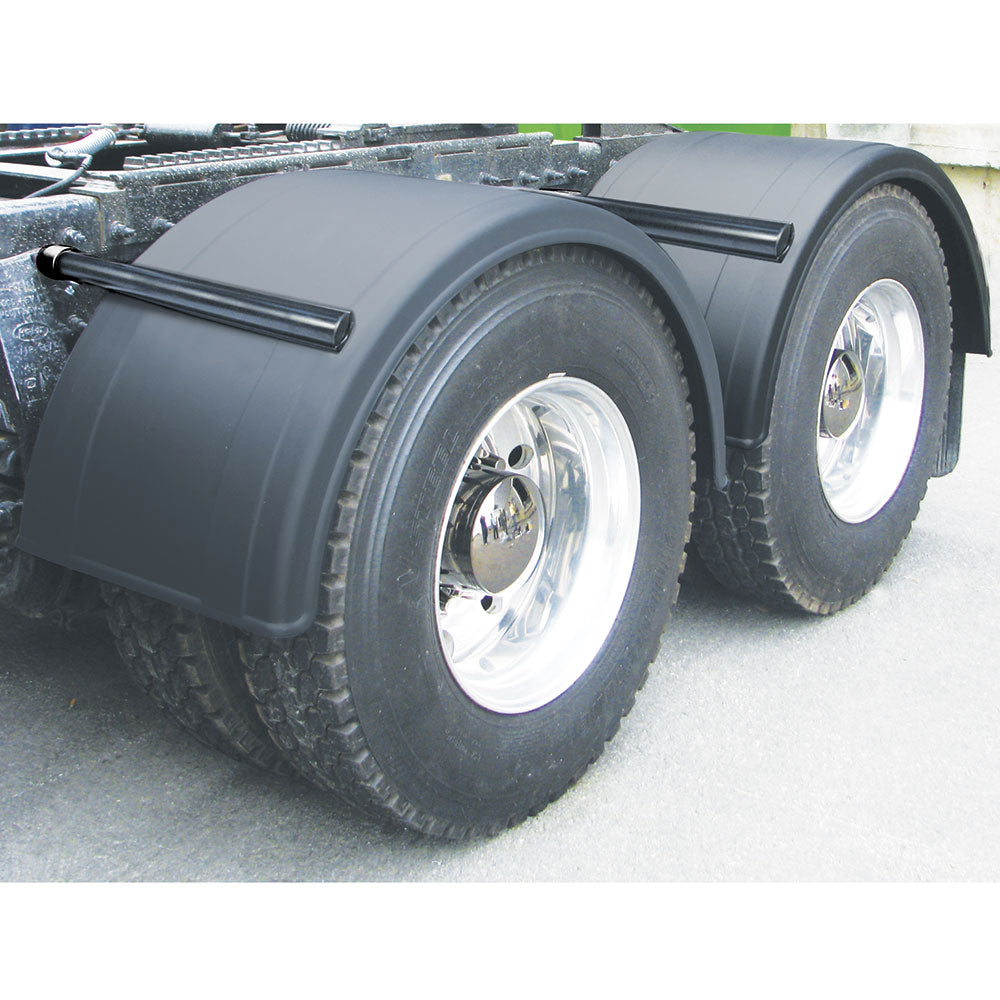 Black poly single axle fenders with rolled edge. 24"W x 24"L, 76" curve.
