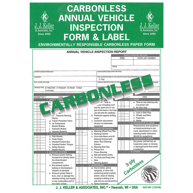 Annual vehicle inspection report form and sticker. Meets DOT requirements. Minimum periodic inspection standards located on the back of each form. Durable manila folder included. 3-ply carbonless copy. 8 1/2" x 11". Self-laminating vinyl label, 5" x 4", included.