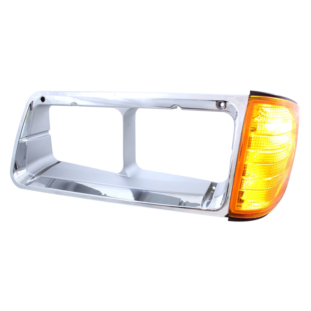 Chrome headlight bezel with incandescent amber turn signal. One-piece design. Fits Freightliner FLD conventional models 1989-2002 with sleeper. Replacement for OEM A06-20738-000 (driver side) and A06-20738-001 (passenger side).