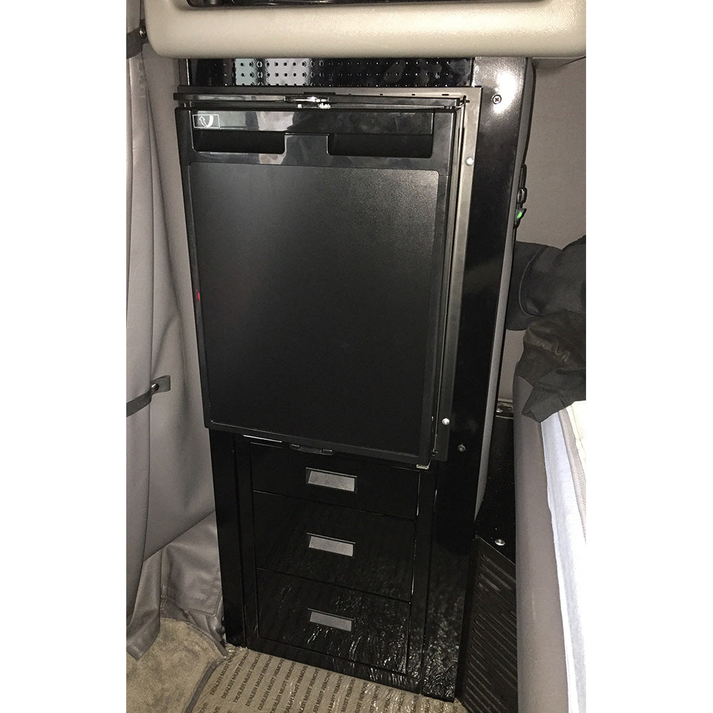 Kit includes a refrigerator and a 3-drawer unit. Mounts on the passengers side.