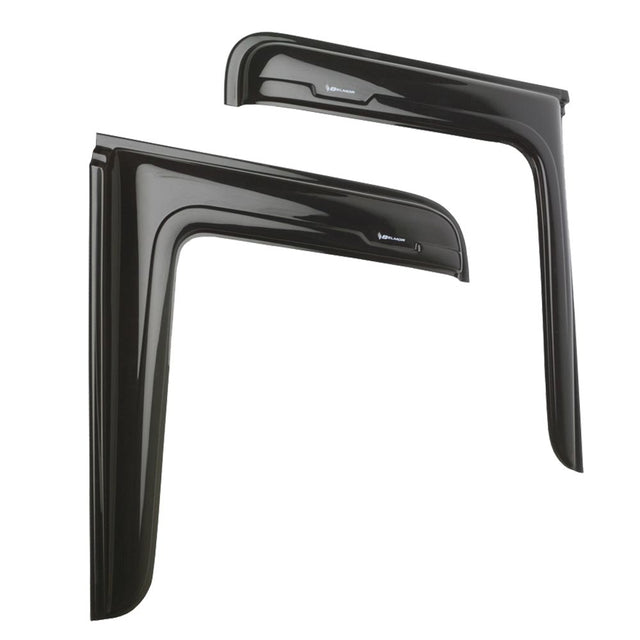 Ventvisors are aerodynamic side window deflectors constructed of smoke acrylic. Easy installation. Covers top of window and extends down the window pillar. Brings fresh air into the cab. Keeps inclement weather out. Lowers interior temperatures while parked. Reduces window fogging. Increases overall driver comfort. Product photos are stock photos. Ventvisors may install on your truck differently that what is pictured.