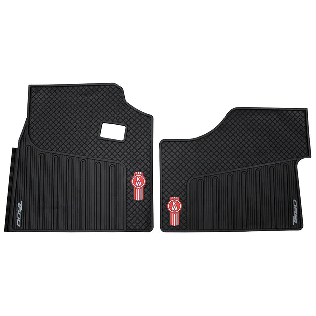 Heavy duty black rubber floor mats designed specifically for Kenworth T880 models 2012 and newer. Features a door sill flange on the drivers side mat. Sold as a pair.