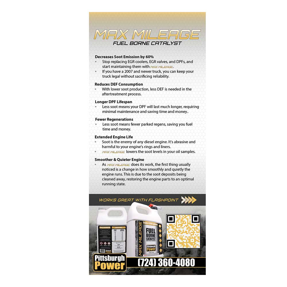 This diesel fuel additive is designed to improve engine efficiency. Enhances fuel combustion to increase fuel economy and cleans soot from the DPF while you're driving. Max Mileage is able to clean the exhaust system and DPF by burning off soot at a much lower exhaust gas temperature. Works on any diesel engine, including diesel fueled pickups and cars.