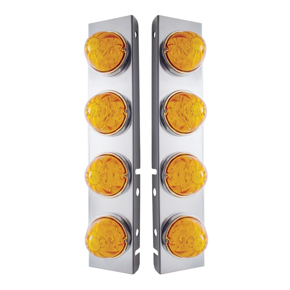 Stainless steel front air cleaner light bars with eight 3" watermelon style LED lights. Single function light with stainless steel bezel. Each light is wired using two .180 bullet plugs. Lights have 17 LEDs each.